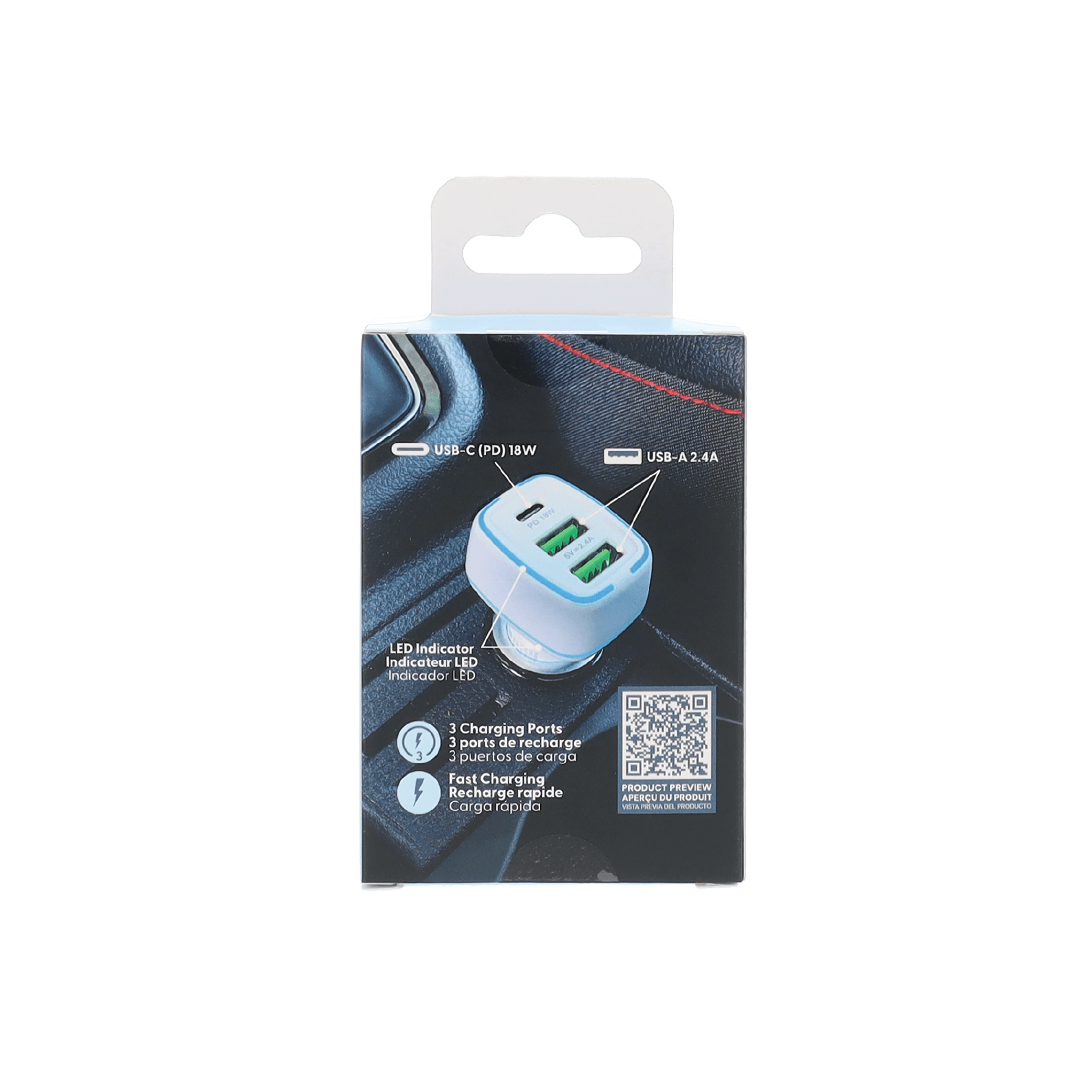 1 USB-C 18W port and 2 USB-A ports (2.4A each)